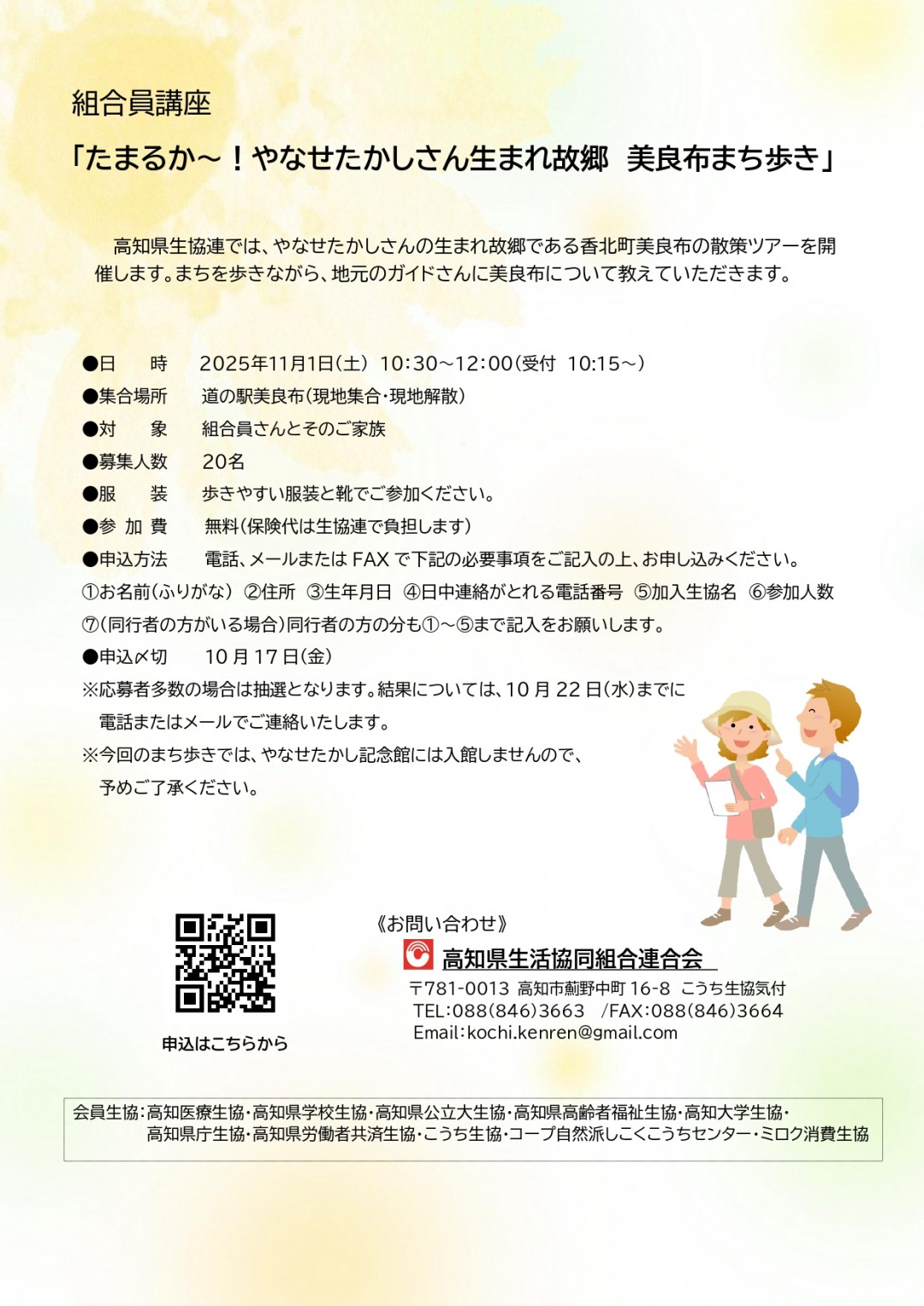 日 時 11月1日(土)10:30~12:00(受付10:15~) 集 合 道の駅美良布(現地集合・現地解散) 募集人数 20名 服 装 歩きやすい服装と靴でご参加ください 参加費 無料(保険代は生協連で負担します) お申し込み方法等詳しくはチラシをご覧ください。 ※お申し込み多数の場合は抽選となります